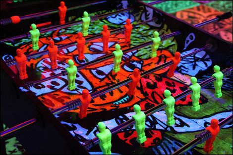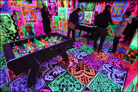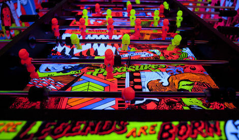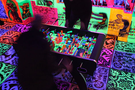 Faile and Bast rebuke the contemporary art world’s fixation on ideas of relational aesthetics and democratization, and give their audience a chance to genuinely engage the work without the looming formality of the traditional gallery. Deluxx Fluxx is entirely interactive, and invites viewers to play a round of psychedelic foosball and take part in the art itself. It is the artists’ intention that viewers will forget they are looking at art, and be captivated by the carnivalesque. The video arcade may be a lost form, but in Faile and Bast’s re-imagining, it gets a temporary and much needed revival.