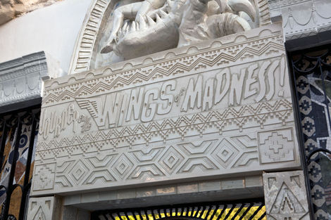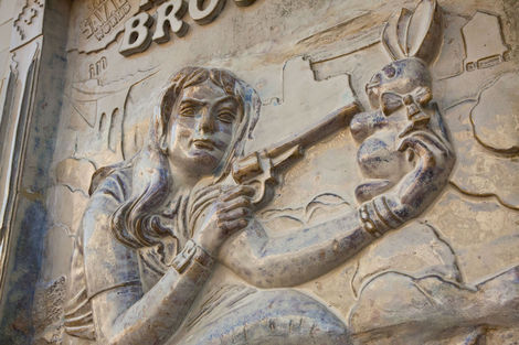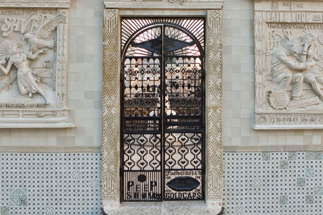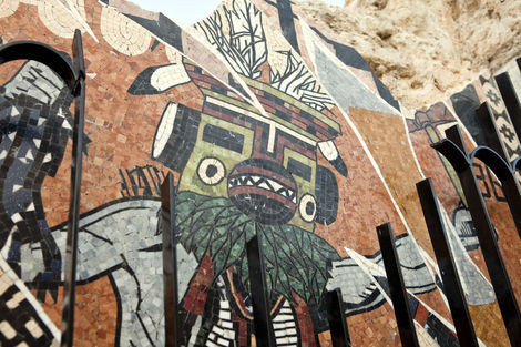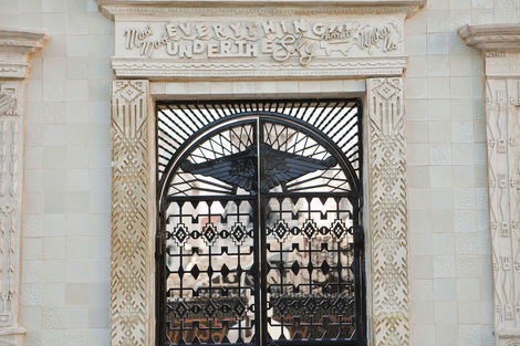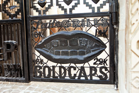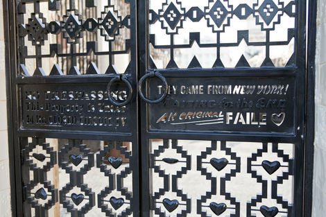In retrospect, such a project seems inevitable: much of Faile’s recent work, from customized Buddhist prayer wheels to an American flag reworked with Pueblo-inspired linework, relies on re-imagining sacred objects on an increasingly grand scale. This year’s Deluxx Fluxx, a functional arcade bedecked in Faile’s trademark commercial iconography and vibrant palette, was a foray into immersive spectacle. Nevertheless, building a church from the ground up in an Iberian country is a symbolically freighted choice, and one that ups the ante considerably. Not only is sacred architecture deployed here as an artistic medium, it is forced to intermingle with the exotic and profane: Brooklyn-style window bars, new prayer wheels, and sculptural relief depicting Faile’s own idiosyncratic archive.