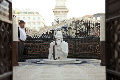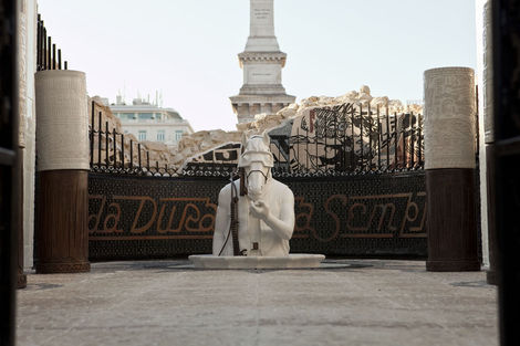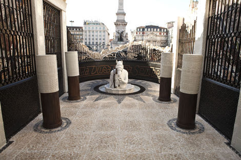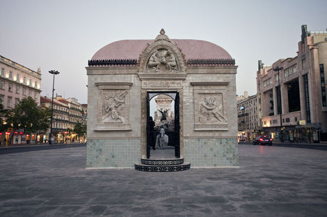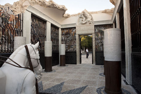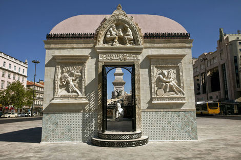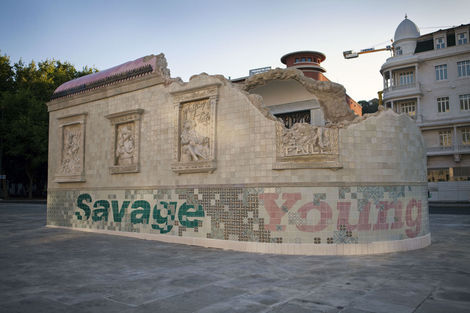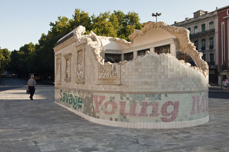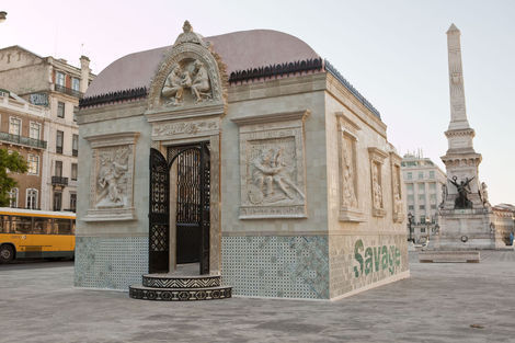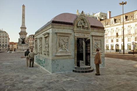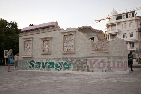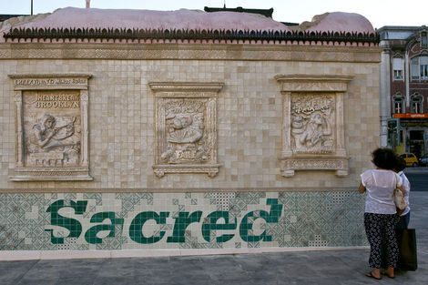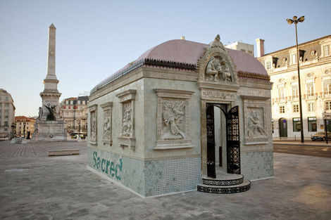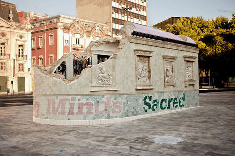 From 16 July to 15 August 2010, the Brooklyn-based artists Faile displayed “Temple,” a full-scale church in ruins in Praça dos Restauradores Square in Lisbon. The installation was made in conjunction with the Portugal Arte 10 Festival and will tour abroad. While Faile is well known by now for their arresting, advertising and Pop inflected prints and sculptures, “Temple” marks the duo’s migration from a more strictly visual medium into the realm of site specific environments. While its structure is the ruin, Temple should not be read as a memento or celebration of decadence but instead as one of collaboration and renewal.