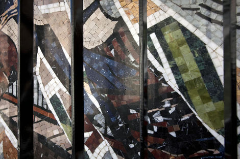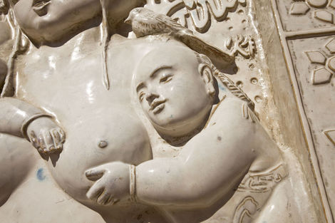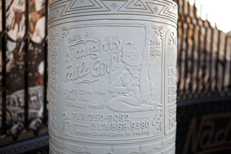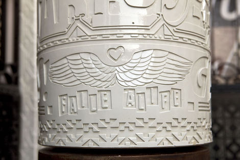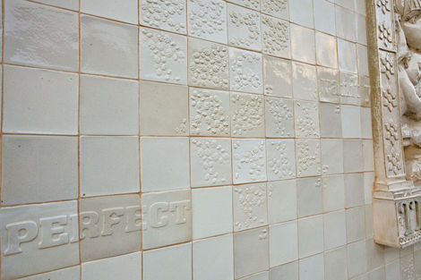 One might object that Faile’s use of religious objects devalues them by making them simply one more signifier in a visual system, divorced from their power and specificity. But the logic of Temple is neither the trivialization of pastiche nor the critical distancing of appropriation. Faile’s process is more aptly described as 3-D sampling, in which seemingly disparate pieces are brought together and reconstituted as something wholly other, but still animated by the energy, the spirit, of the original. In this case of course, the source material is 15th c. Florentine sculptor Luca Della Robia, not George Clinton. The result is a new site of public communion that recognizes religion as the social artifact that it is, but reminds us again of an underlying desire for unity that is often occluded by our urban edifices, be they cathedrals or skyscrapers.