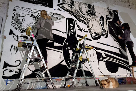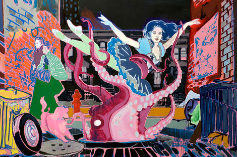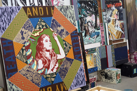 At the same time, FAILE’s work seeks to explore the contradictions and hidden meanings within larger social landscapes. Under the surfaces of their playful and desirous city streets, darker forces lurk—be they systems of power and domination, the uncanny registers of youth, or literal monstrosities. Strong Currents finds FAILE meditating on hidden worlds, drawing their signature juxtaposition of high and low, sacred and sinister to new realms.