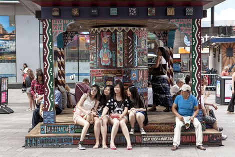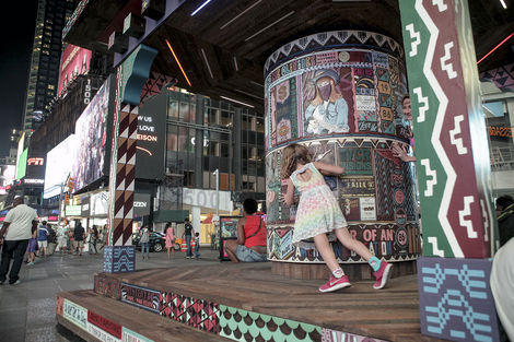 FAILE and Times Square Arts bring FAILE: Wishing on You, an installation reimagining Asian prayer wheels in the context of Times Square’s kaleidoscopic history, to the Broadway plaza between 42nd and 43rd Streets from August 17 – September 1, 2015. An unveiling will take place on Monday August 17th at 11:00am. The installation is presented in collaboration with FAILE’s exhibition, FAILE: Savage/Sacred Young Minds, running at the Brooklyn Museum from July 10- October 4, 2015.